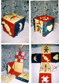 С внешней стороны (фото 1,2,3) каждая грань куба эстетически оформлена и несёт в себе определённое назначение. Детям нравится рассматривать различные изображения, трогать, ощупывать бусинки, пуговки, бантики. При этом можно научить ребёнка описанию, сравнению предметов. Кроме того, верхняя грань куба (фото 1) может использоваться в игре «Чудесный мешочек». Спрятать в закрытом кубе какой-либо предмет и определить на ощупь (по загадке), что спрятано.