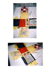 На фото 3 «Чудо-куб» изображён в развёрнутом виде. Здесь можно увидеть различные виды соединений граней куба: застёжки-молнии, пуговицы, шнуровка, кнопки, застёжка-петелька. При сборе куба дети упражняются в использовании различных видов соединения частей друг с другом. На фото 4,5,6 можно увидеть внутренний вид «Чудо-куба» в развёрнутом виде. Рассмотрим его более подробно:
